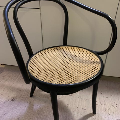 Ton stol i hvidt træ med en aftagelig grå hynde. Stolen har en klassisk design med ryglæn bestående af spiler. Velegnet til spise- eller køkkenbrug.