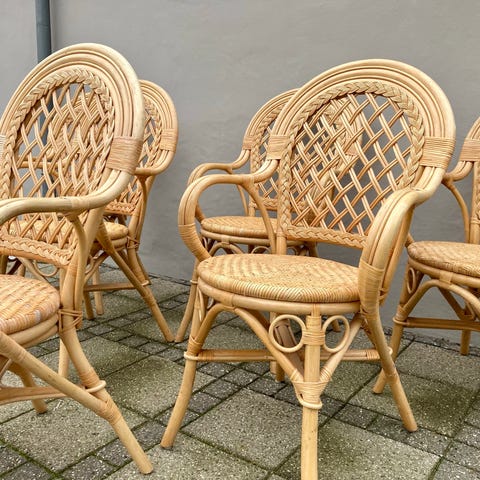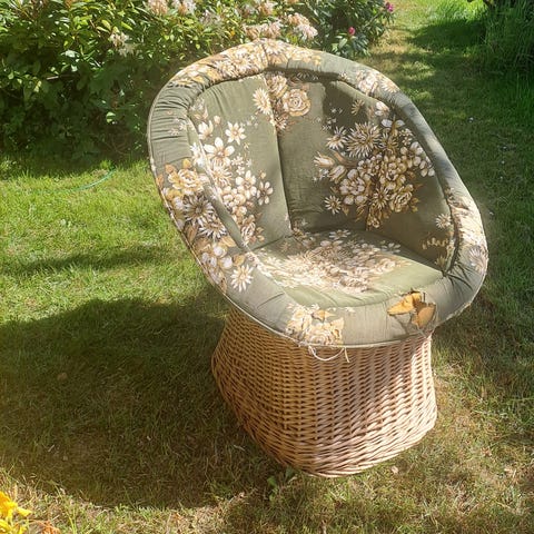 Kurvestol, udført i flettet naturmateriale. Højde 93 cm, sædehøjde 46 cm, bredde 61 cm. Stolen fremstår i pæn stand.
