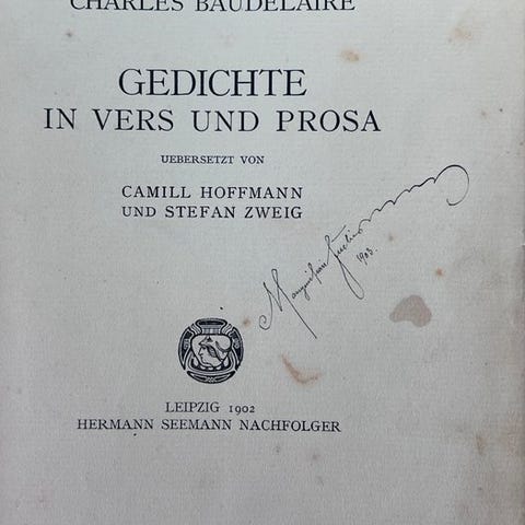 Den berømte franske digtsamling - Syndens blomster (ikke ondskabens blomster - og det er ikke sikkert at digteren helt tog afstand fra synderne) på dansk - i en fin lille fransk, hæftet, lidt slidt udgave.