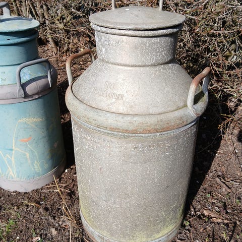 Gammel mælkespand fremstillet i metal med rustik overflade. Spanden har en rund form med håndtag til nem transport. Velegnet til dekorative formål eller som samlerobjekt.