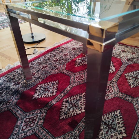 Glasbord med firkantet glasplade og fire træben. Bordets mål er 105x105 cm. Glaspladen er tyk og gennemsigtig, og benene er koniske i træ. Bordet har et enkelt og funktionelt design uden yderligere dekorationer.