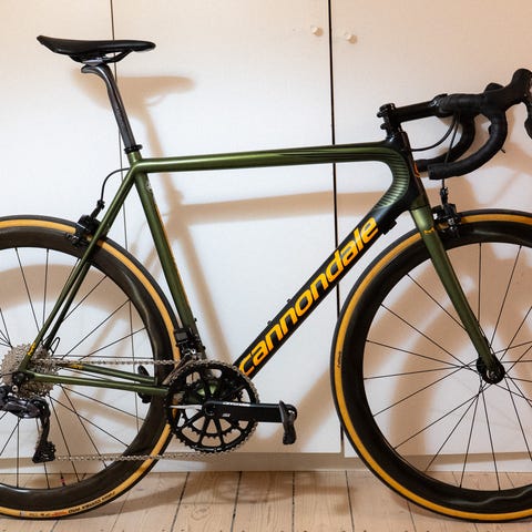 Fuld carbon ramme fra Cannondale i størrelse 52. Udstyret i 2x11 speed Ultegra (skiftere, brenser og krank) med BB adapter for at undgå knirkende pressfits. Brifters er 105. Ruller på hurtige Pirelli P Zero dæk med massere af liv tilbage. 38cm bredt styr fra FSA og 170mm krankarme til de lidt kortere ben