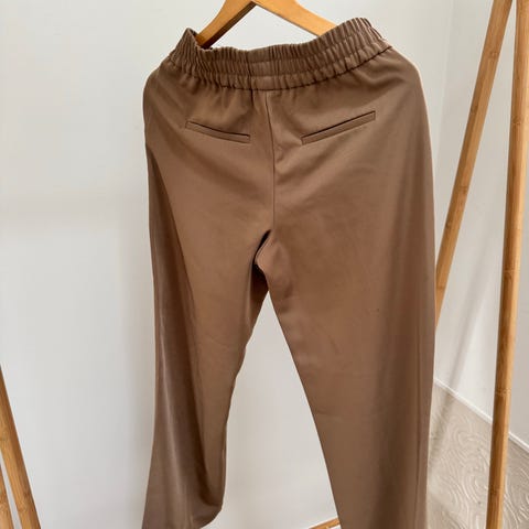 Bukserne har lange lige ben. De har en mellemhøj talje med fast linning, samt skjult lynlås og knaplukning. De har bæltestropper samt lommer i siden og snydelomner bagpå.