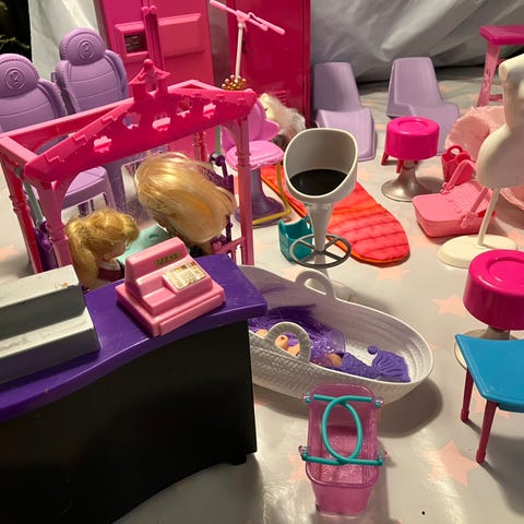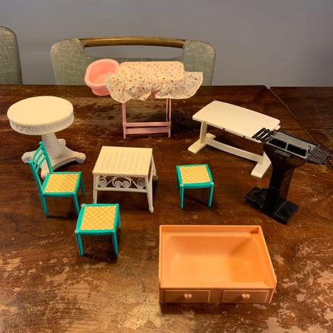Barbie Mattel møbel sæt fra 1980erne bestående af en hvid lænestol med udtræk og et pink reolsystem med hylder og skuffer. Fremstillet i plast, designet til brug med Barbie-dukker.