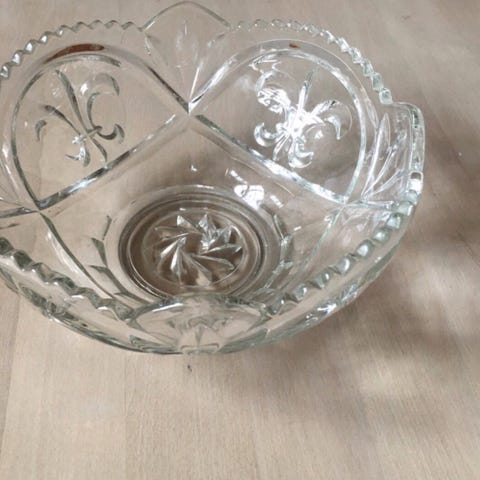 Diameter 15,6 cm højde 2,5 cm. Mundblæst i form. Kuglet bund. Antageligt fransk ca. 1930.