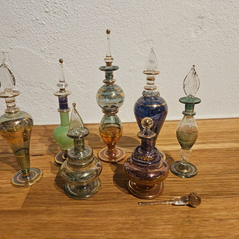 3 stk gamle parfume flasker og 2 stk gamle medicinflasker. Højden går fra 11cm til 17 cm. Den højest smalle flaske er antik, nok fra slutning 1800 tallet. Sælges samlet 150kr.