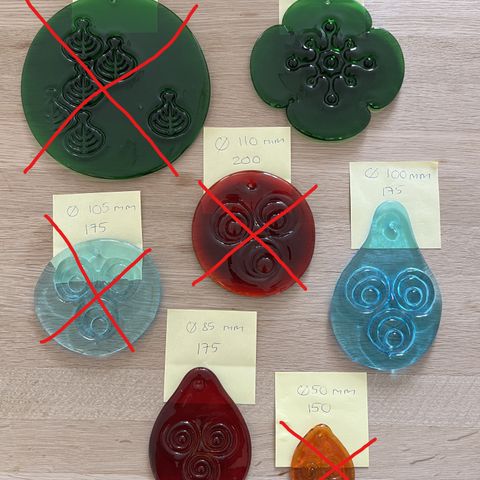 Antik Grøn Holmegård glas ophæng med et reliefmønster bestående af tre sammenkoblede spiraler. Flot rund men en smule oval mørk grønt glas.