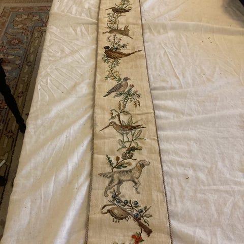 Klokkestreng med jagtmotiver, usædvanligt flot broderet og monteret med beslag. Bredde: 12 cm. Længde ekskl. beslag: 166 cm. Længde inkl. beslag: 180 cm. Ann. nr. T176