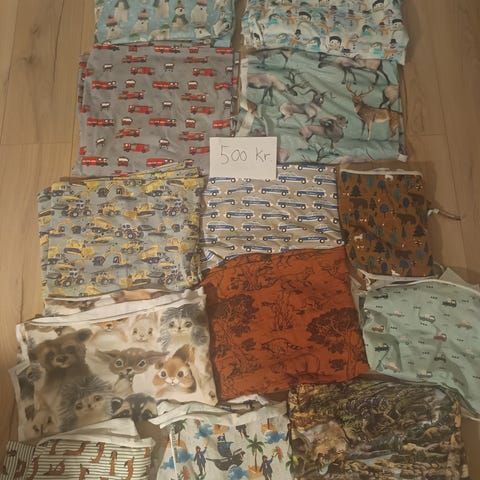 Det grå med katte samt stof med pingviner er med flonel bagside og er 170 i bredde. Alt er i bomuld.