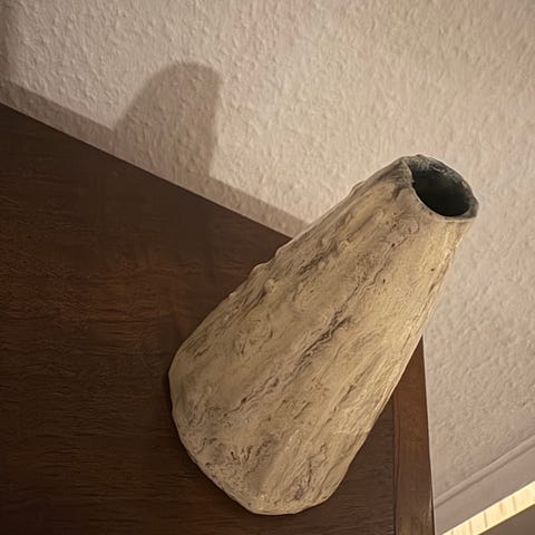 Keramik vase med håndmalet dekor og to øre-håndtag. Vasen har en rustik overflade med jordfarver og blå detaljer. 40cm høj