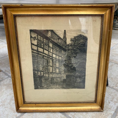 Gammelt tryk i guldramme med glas. Oprindeligt tegnet af Otto Holm 1927. Måler 46x55 cm - udvendig mål. Sendes ikke, men kan hentes på adressen.