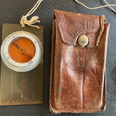 Kompasset er i god stand med klare markeringer og en flydende nål, der peger korrekt mod nord. Det har et indbygget spejl og sigtesnor, som gør det nemt at tage præcise pejlinger. Der er også en lineal på siden.