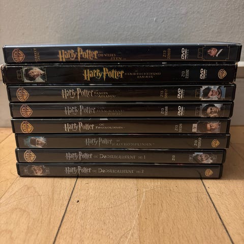 Harry Potter DVD-samling bestående af 8 film. Indeholder alle film i serien med forskellige omslag. Filmene er på DVD-format og kan bruges til hjemmeunderholdning.