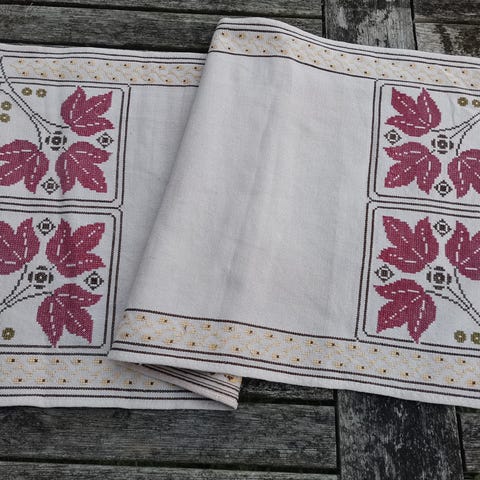 Længde 90 cm, bredde 37 cm. Broderet på uld-stof.