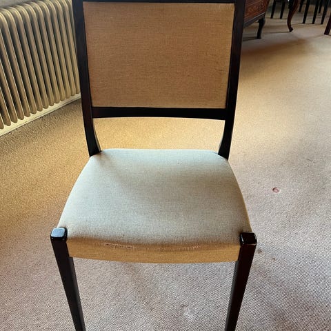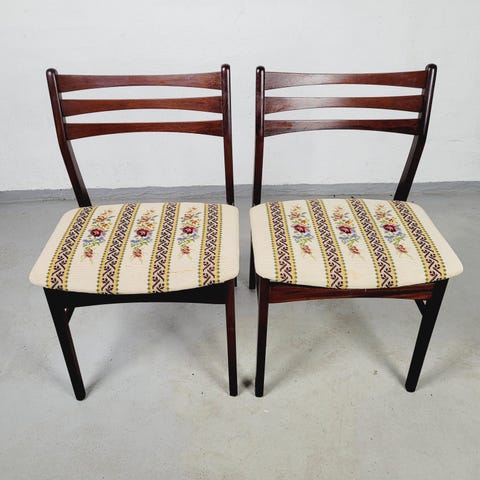 Spisestuestol i palisander designet af Vestervig Eriksen. Flet har skader efter lim. Ellers i pæn stand med overfladiske brugsspor (tryk og ridser). Samlinger er intakte.