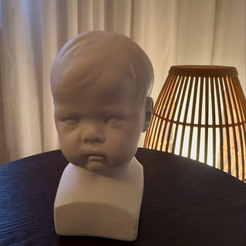 Figur af et siddende barn fremstillet i hvid gips. Figuren viser et barn med hænderne på kinderne og sidder på en oval base. Overfladen er glat med enkelte mærker og pletter. Figuren har skridsikre puder under basen for stabilitet.