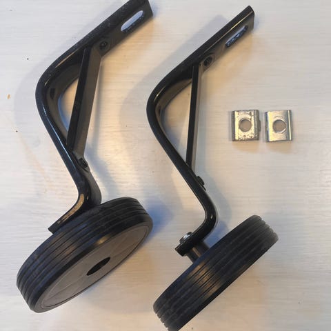 Træningshjul til cykel med hvide plastikhjul og metalbeslag. Designet til at monteres på cykler for at hjælpe med balance under indlæring af cykling. Hjulene har en diameter på cirka 13 cm og er velegnede til børnecykler.