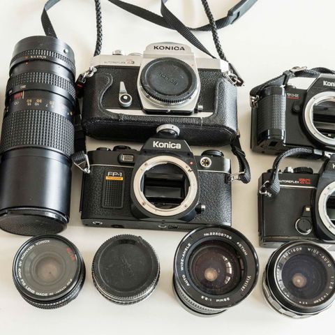 Vintage Konica kamera. Inkl. 3 objektiver;