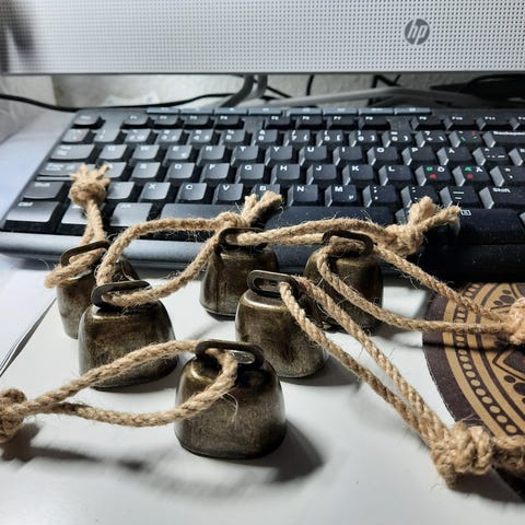 Røde træ juleklokker, I alt 8 retro, røde træ juleklokker. Alle i fin stand med tråd til ophæng og knebel.