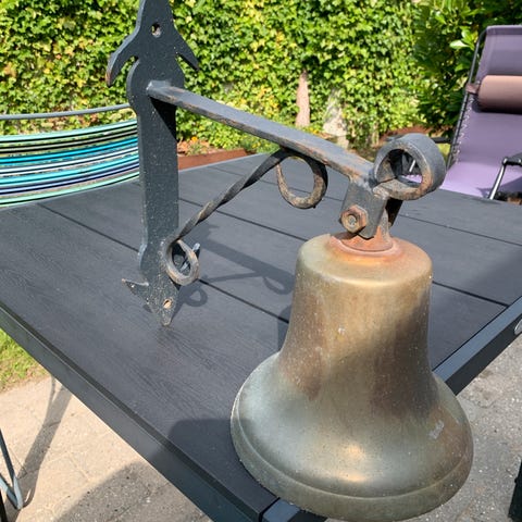 Sælger denne charmerende og robuste färeklokke. Den er ideel til dig, der soger en aldre, autentisk klokke med et rustikt udtryk, perfekt som dekoration i haven, pả terrassen, ved hoveddoren eller i et sommerhus.