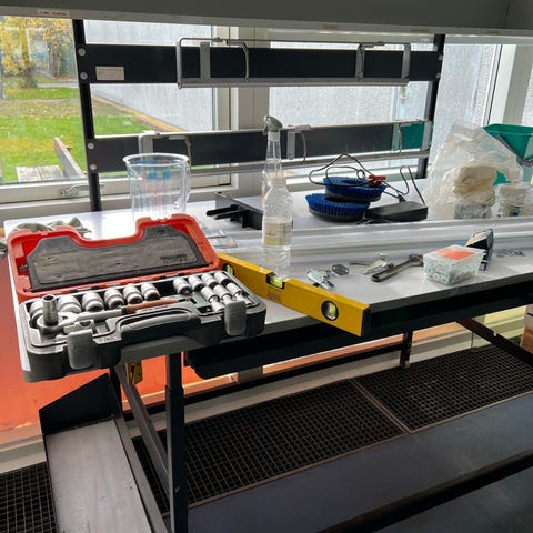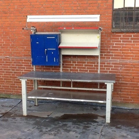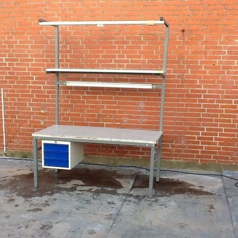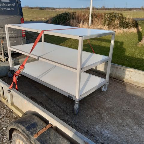Bordet er lavet i metal og kraftigt træbordplade med hvidlaminat øverst. Bagdelen med hylerne kan afmonteres, er boltet sammen
