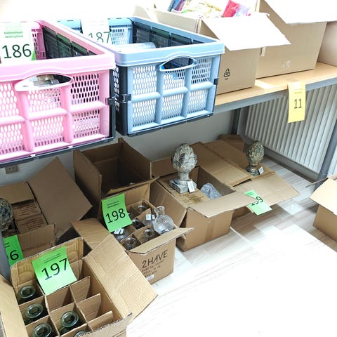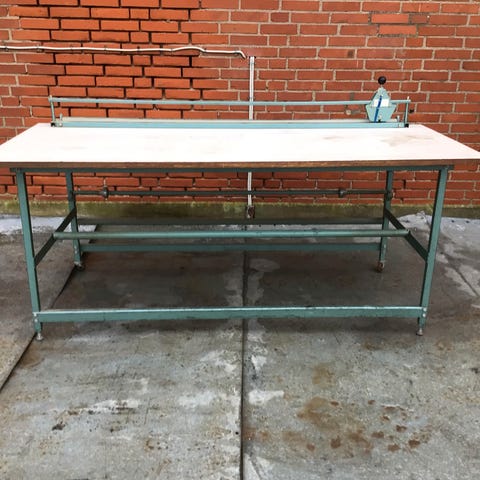 1 x brugt pakkebord, med pap og parirskære med 2 topruller, en under rulle og hyller og en papirkrøller, kan afmoteres, unden værktøj