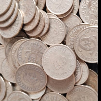 100 stk mønter 1 og 2 dansk kr siden 1925-1926 100 år gammel.