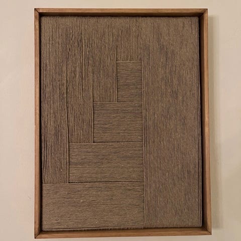 Værk i macramé garn i klare farver, monteret i pink ramme.