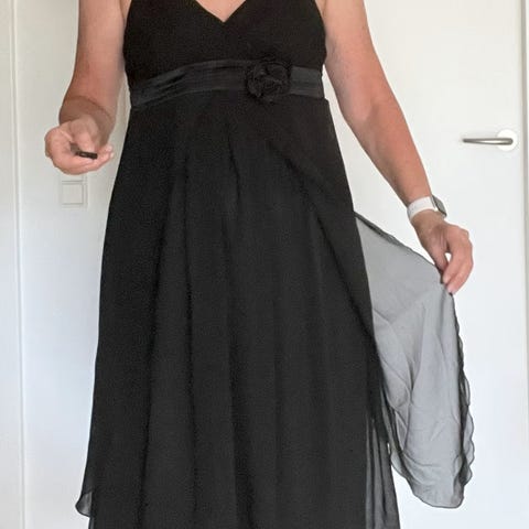 Vila Fest/cocktail kjole i sort farve, størrelse L. Kjolen har lange ærmer og et draperet halsudsnit. Materialet er blødt og behageligt, velegnet til formelle lejligheder eller fester.