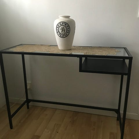 Skrivebord med sort/brun bordplade og sorte ben, har lidt brugsspor, men er elles helt fint.