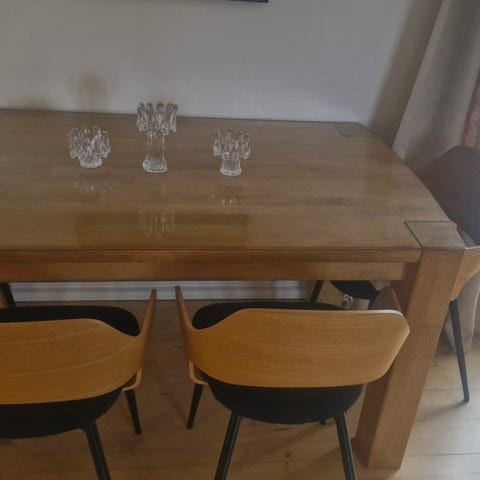 Bord med tillægsplader. Stole i forskellig stand. Kan leveres for 500 i nærområde