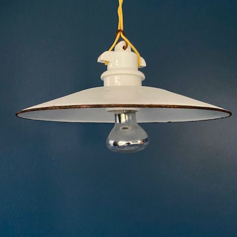 Hvid retro emalje lampe uden ledning. Den er i creme hvid farve, og uden buler eller andet.