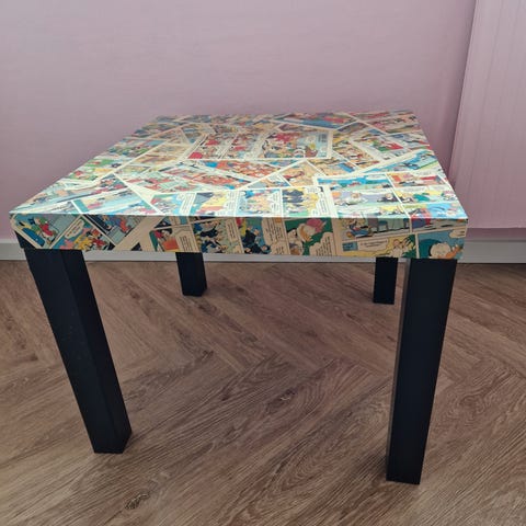 Sjov og unik stol som er tapetseret med gamle Anders And blade og lakeret.
