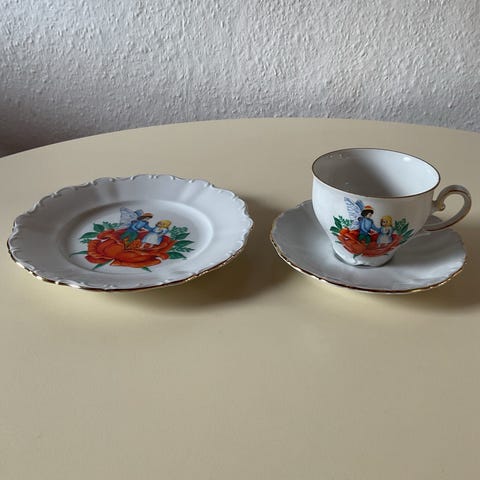 H C Andersens kaffekop og kagetallerken med motiv Tommelise årg 1975 - uden skår kr 75.