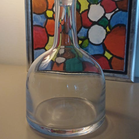 Blå glaskaraffel med klar glasprop,Afhentes i:,Røde Kors Østbirk (609),Bemærk at mail, chat og beskeder ikke besvares, og varen skal købes på knappen "Gå til varen"