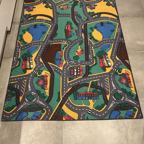 Gulvtæppe i råhvid fra OYOY med bilbane i sort. Brugt på værelse men i fin stand. Materialet er 100% bomuld. Måler 180 x 70 cm. Fra røg og dyrefrit hjem. Se mine øvrige annoncer og vi finder en god pris. Sælger drengetøj str 56-134 og pigetøj str 56-176, som løbende bliver oprettet. Spørg gerne hvis du søger noget specifikt.