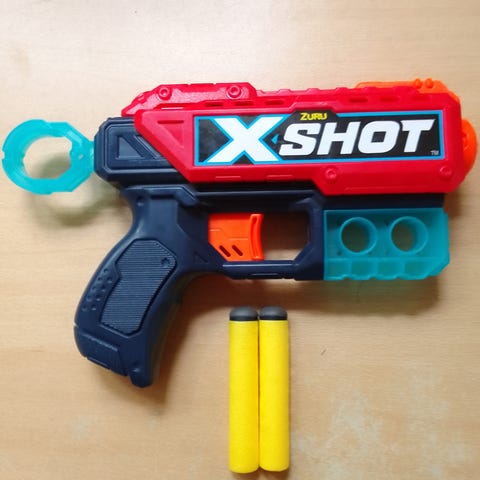 Nerf blå legetøjspistoler med tilhørende bløde skumprojektiler. Designet til leg og målrettet mod børn. Fremstillet i holdbart plastmateriale med orange og sorte detaljer. Sættet inkluderer tre pistoler og flere skumprojektiler.