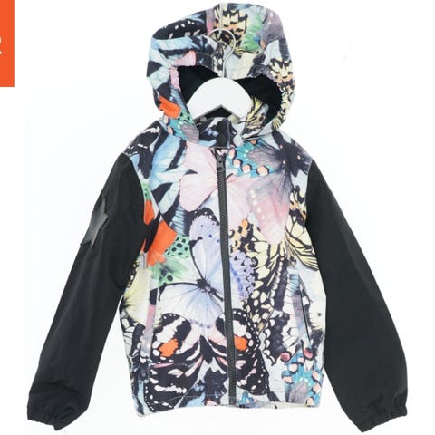 En overgangsjakke med mønster fra Molo. Jakken har en hætte og lynlåslukning foran. Materialet ser slidstærkt ud, og jakken har elastiske manchetter. Velegnet til udendørs brug i overgangsperioder mellem sæsoner. Størrelsen er 128.