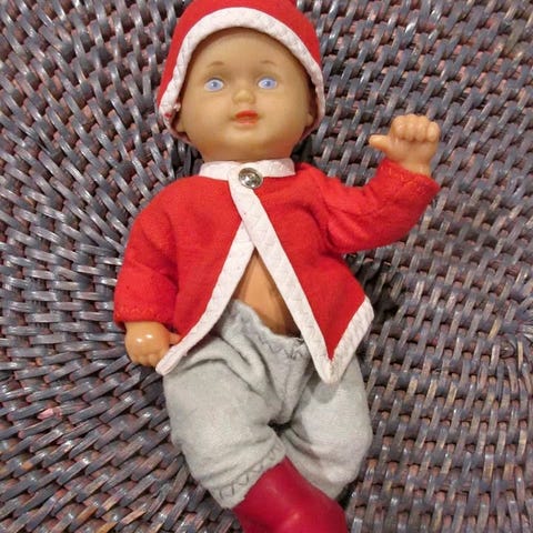 15. Ønskedukke i plast fra 1960erne. 16 cm. Kan ikke tyde stemplet. Muligvis italiensk. 25 kr.