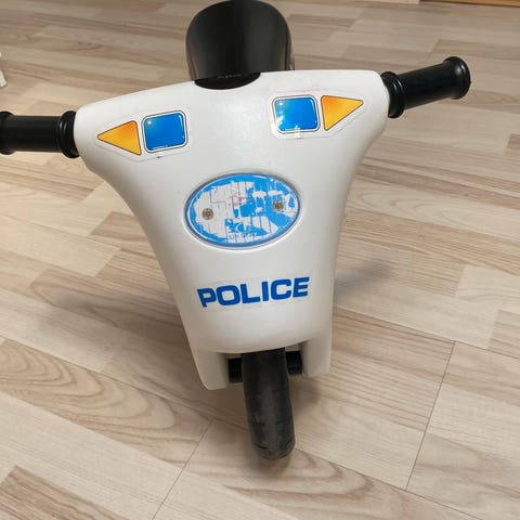 Politi legetøjsmotorcykel i sort og hvid. Designet til børn, lavet af plastikmateriale. Motorcyklen har et simpelt design med store hjul og håndtag til nem betjening. Egnet til leg og udvikling af motoriske færdigheder.