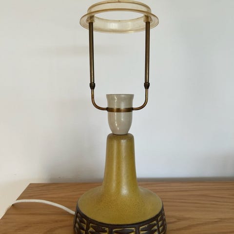 Vintage bordlampe i blå porcelæn med hvide dekorative motiver og gulddetaljer. Lampen har en højde på cirka 36 cm og er udstyret med en almindelig pærefatning. Egnet til brug som dekorativ belysning i hjemmet.