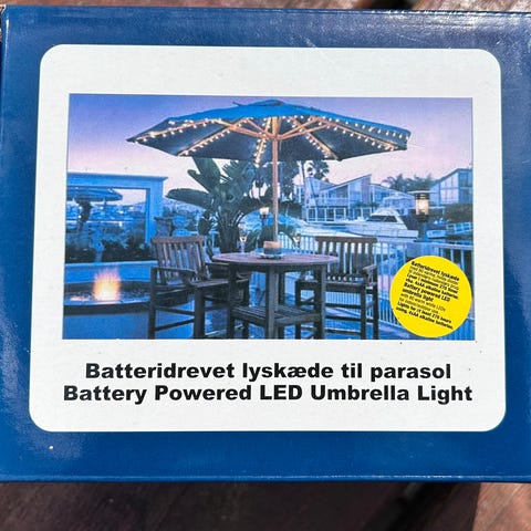 Ubrugt parasollampe med led-lys i kold hvidt lys. Til både indendørs og udendørs brug.