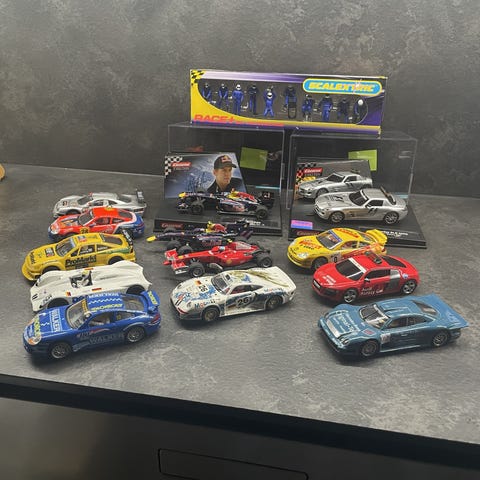14 racerbiler i forskellig stand, 4 x Scaletrix og 10 x Carrera/Hornby