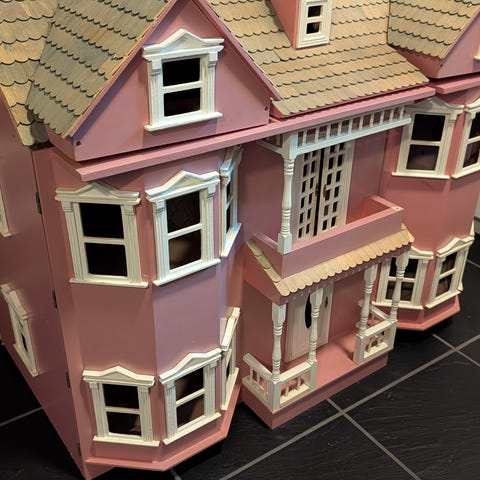 Gl stort dukkehus i træ med gul facade og rødt tag. Det har mange dejlige detalier som ses på billederne. Huset har flere rum, køkken og entre inklusive en trappe til 1. Sal.
