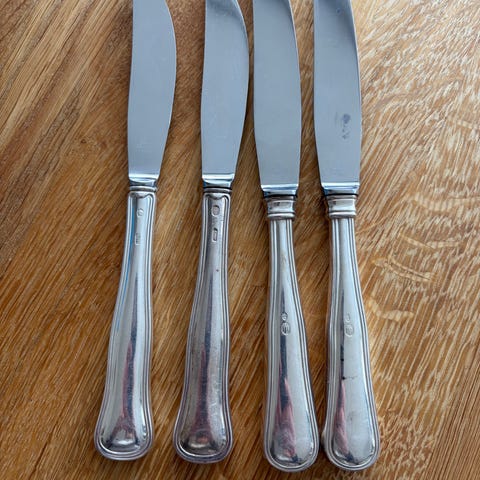 Sæt med 12 antikke spise knive med pletsølvhåndtag. Knivene har en klassisk design dobbelt riflet i pletsølv mens klingen er af rustfrit stål. Knivene er ensartede i størrelse og design.