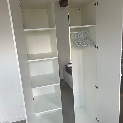 Klædeskab med bøjlestang i hvid laminat. Er som nyt. Skabet er samlet og sælges grundet flytning.