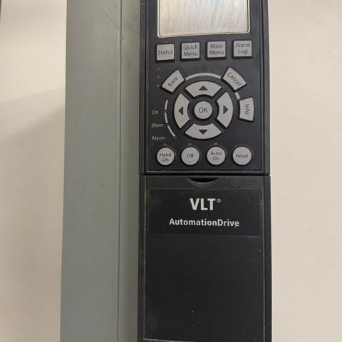 Danfoss VLT HVAC Drive frekvensomformer. Enheden har indbygget kontrolpanel med display og knapper til indstilling og overvågning. Designet til styring af elektriske motorer med variabel hastighed. Fremstillet i robust materiale med køleplader til effektiv varmeafledning. Anvendes i industrielle applikationer til præcis motorstyring. 4.0 KW / 5 HP