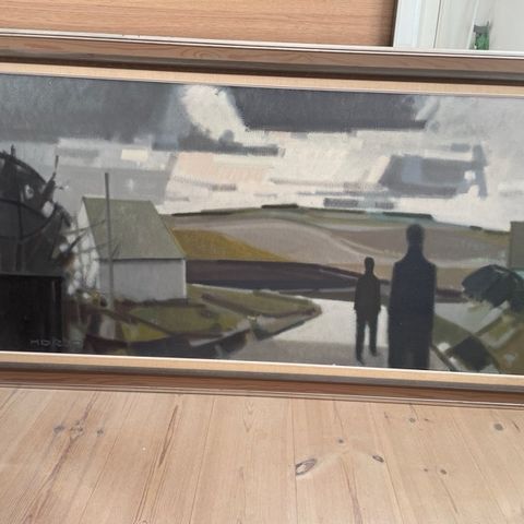 Maleriet er indrammet i en hvid og guldfarvet ramme med lette brugsspor. Signatur er synlig i nederste højre hjørne (se billeder).