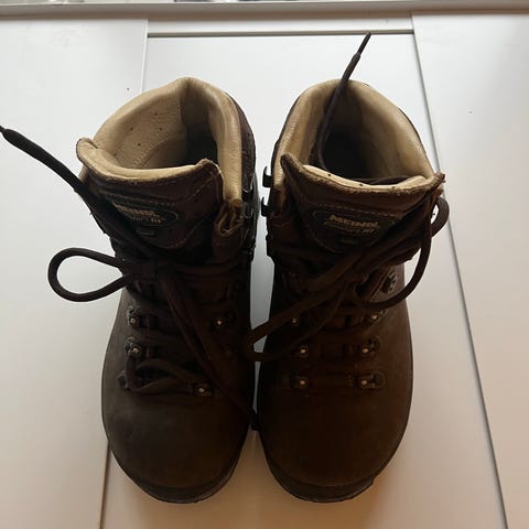 Meindl vandrestøvler i læder med gore-tex (vandtætte). Har været super glad for dem på vandretur. Er snavsede men i rigtig god stand.