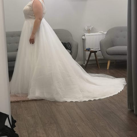 Kjolen er blevet rettet til i længden(er 162 høj +5cm hæl), flere tykkere underlag er fjernet (men er ikke gennemsigtig), og slids i venstre side er åbnet op - ergo kjolen er væsentlig lettere/luftig at have på, men giver fortsat et “prinsesse” look.